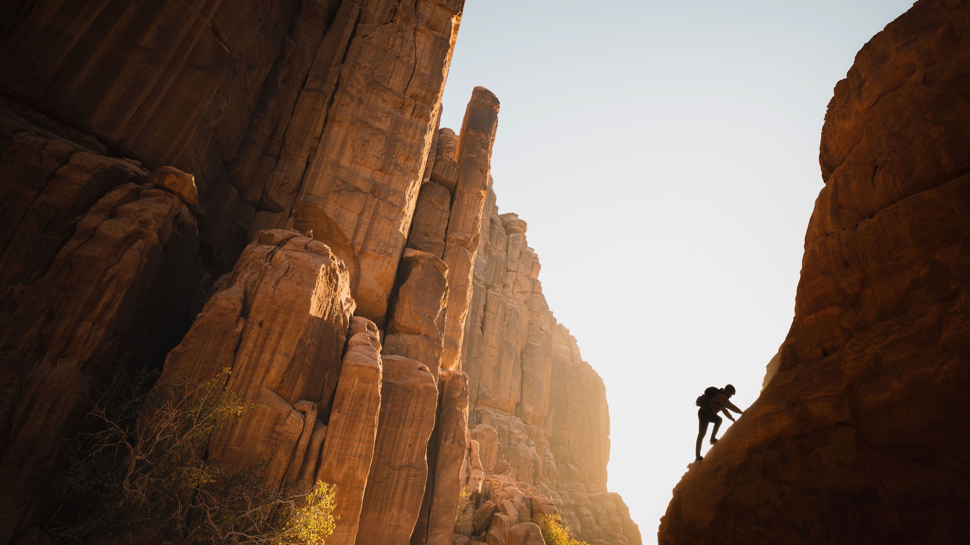 途方もない高さと険しい岩肌が織りなす挑戦の舞台で、岩の隙間に差し込む光が冒険の進む先を照らしています。頂点から広がる風景は新たな可能性への扉を開きます。